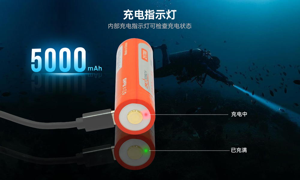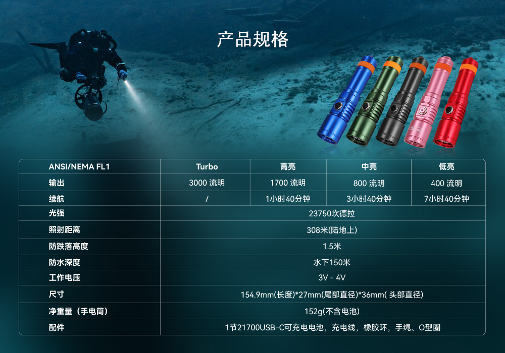 | 配件 | 1節21700可充電電池,充電線(xiàn),橡膠(jiāo)環,手(shǒu)繩、O型圈 | |||