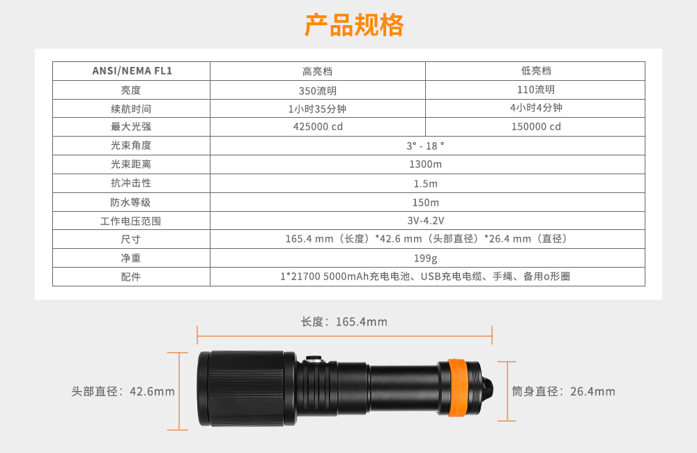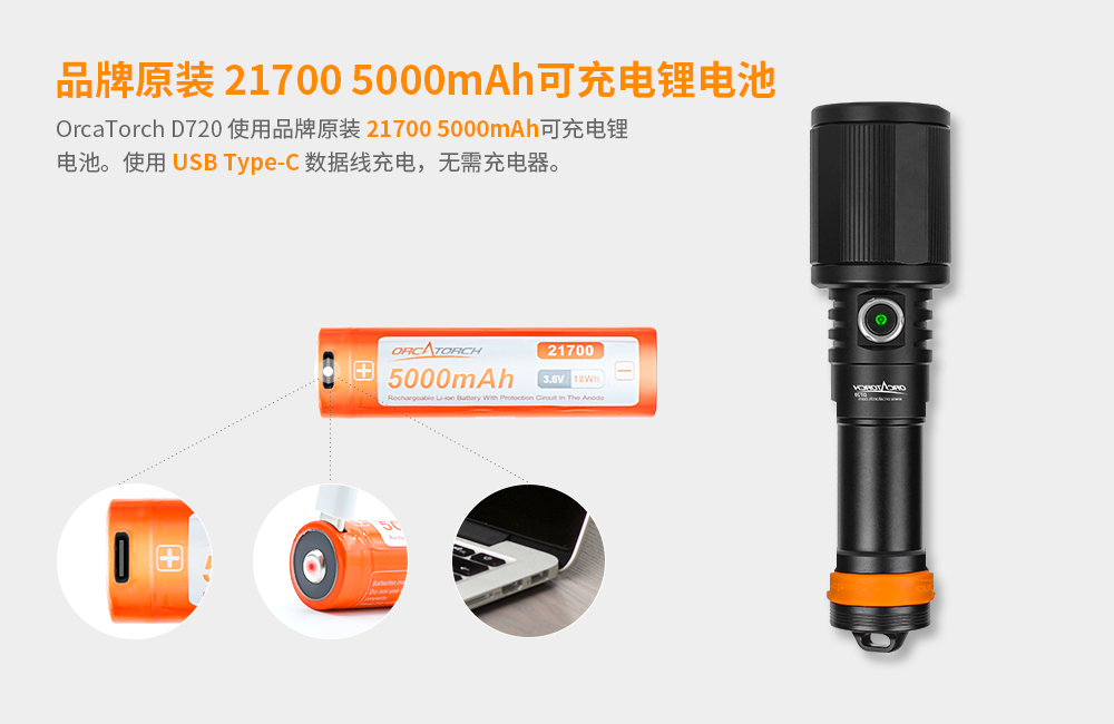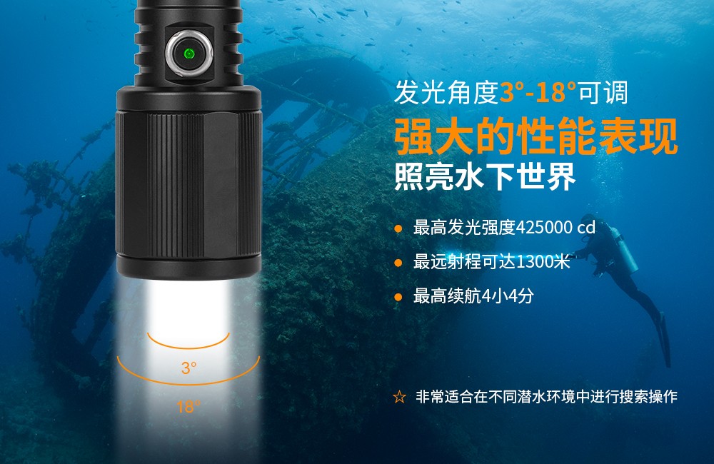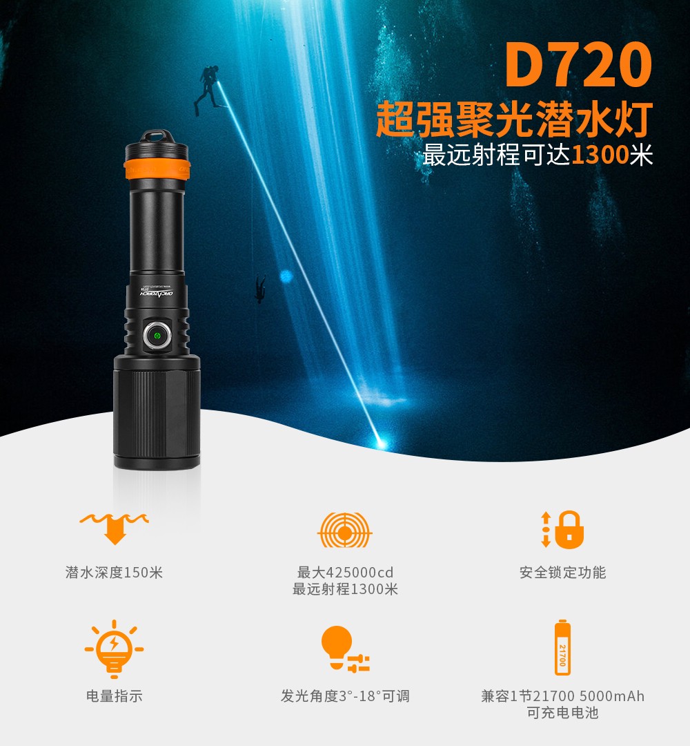 無論你是(shì)一個娛樂或專業潛水員,你(nǐ)都會發現OrcaTorch D720 遠射強光潛水燈,在水下活動中非常(cháng)之有用。最大光強達425000坎德拉,最大射程1300米,配備一節21700 5000mAh可充電鋰離子電(diàn)池,是同類產品中(zhōng)最強的手(shǒu)電筒之一,滿足潛水遠距離照明(míng)的需(xū)要。單按鍵操作,一鍵切換”高-低-關機”。通過旋轉筒頭調節光束(shù)角度3°-18°,在不(bú)同的環(huán)境下可輕鬆進行潛水搜索。